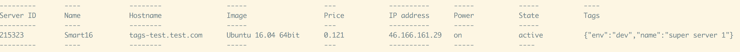 cherryctl add server -s tags-test.test.com -i 'Ubuntu 16.04 64bit' -l 92 -p 79813 -g EU-East-1 --tags "env=dev,name=super server 1"